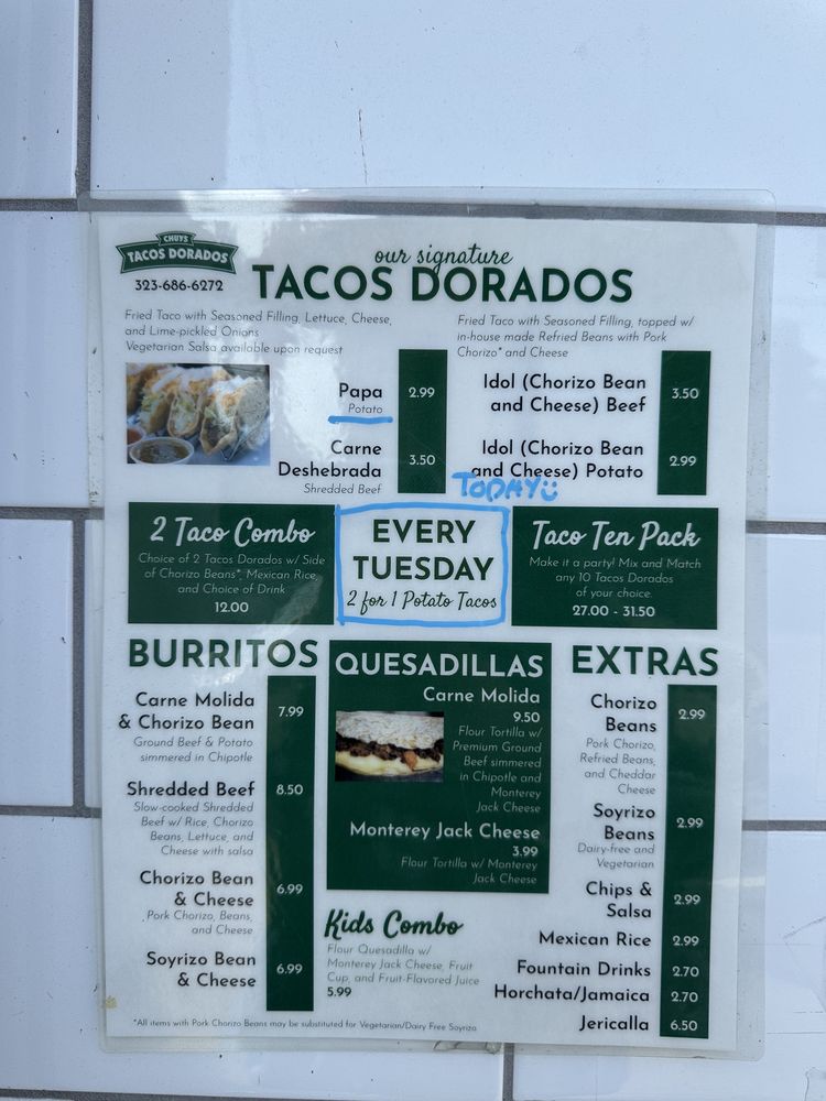 Chuy’s Tacos Dorados Menu (Update 2025)
