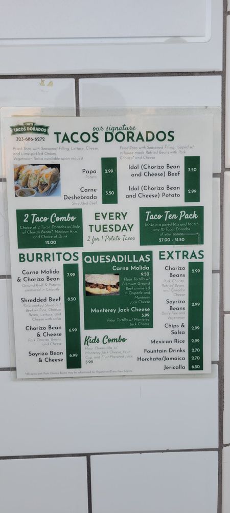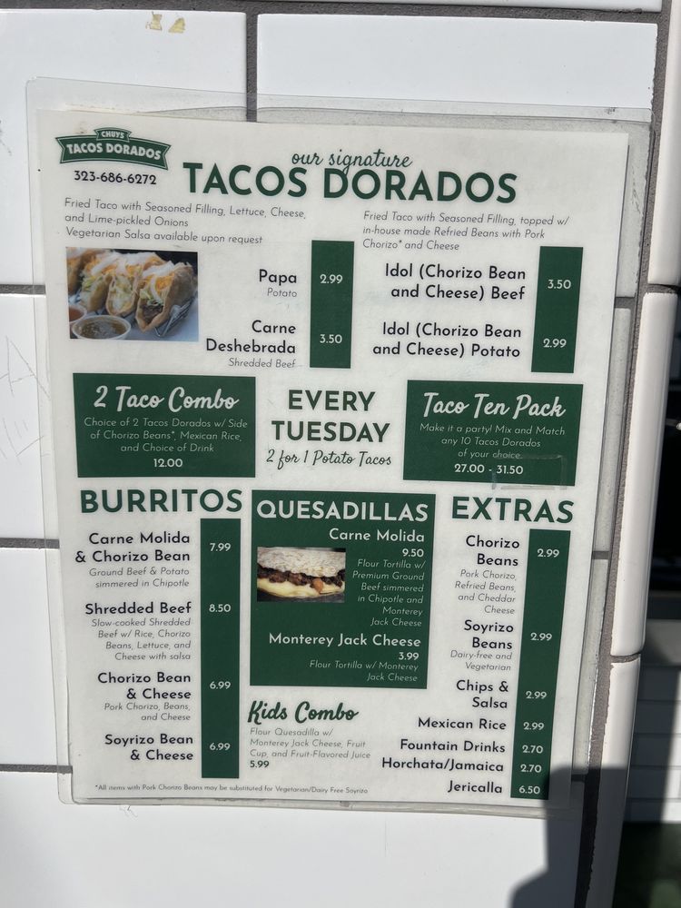 Chuy’s Tacos Dorados, located in Los Angeles, offers a variety of tacos with unique flavors and options. Customers rave about the Shredded Beef Taco, praised for its tender meat and crispy shell. The Idol Potato Taco is noted for its flavorful combination, while the Carne Molida Taco offers a different taste profile. The menu also includes options like the Idol Beef Taco and Carne Molida Quesadilla. Customers appreciate the quality and flavor of the tacos, with many recommending the extra side of lime-pickled onions and salsas for an added kick. The restaurant's self-service system and casual atmosphere make for a convenient and enjoyable dining experience. With its Latinx and women-owned status, Chuy’s Tacos Dorados stands out as a must-visit for taco enthusiasts in LA.